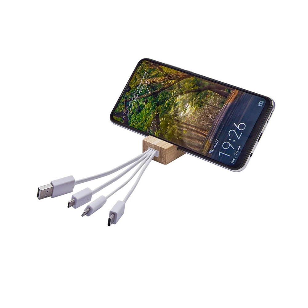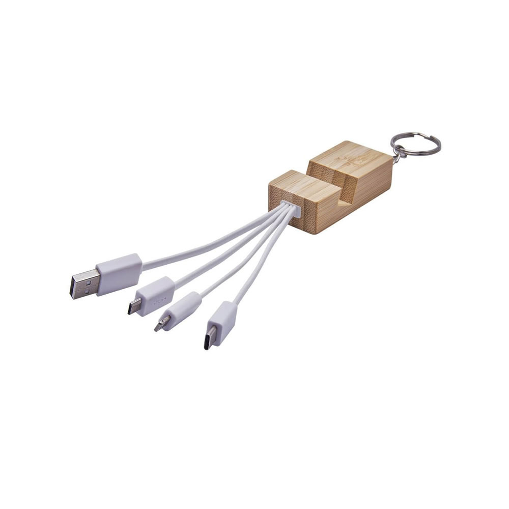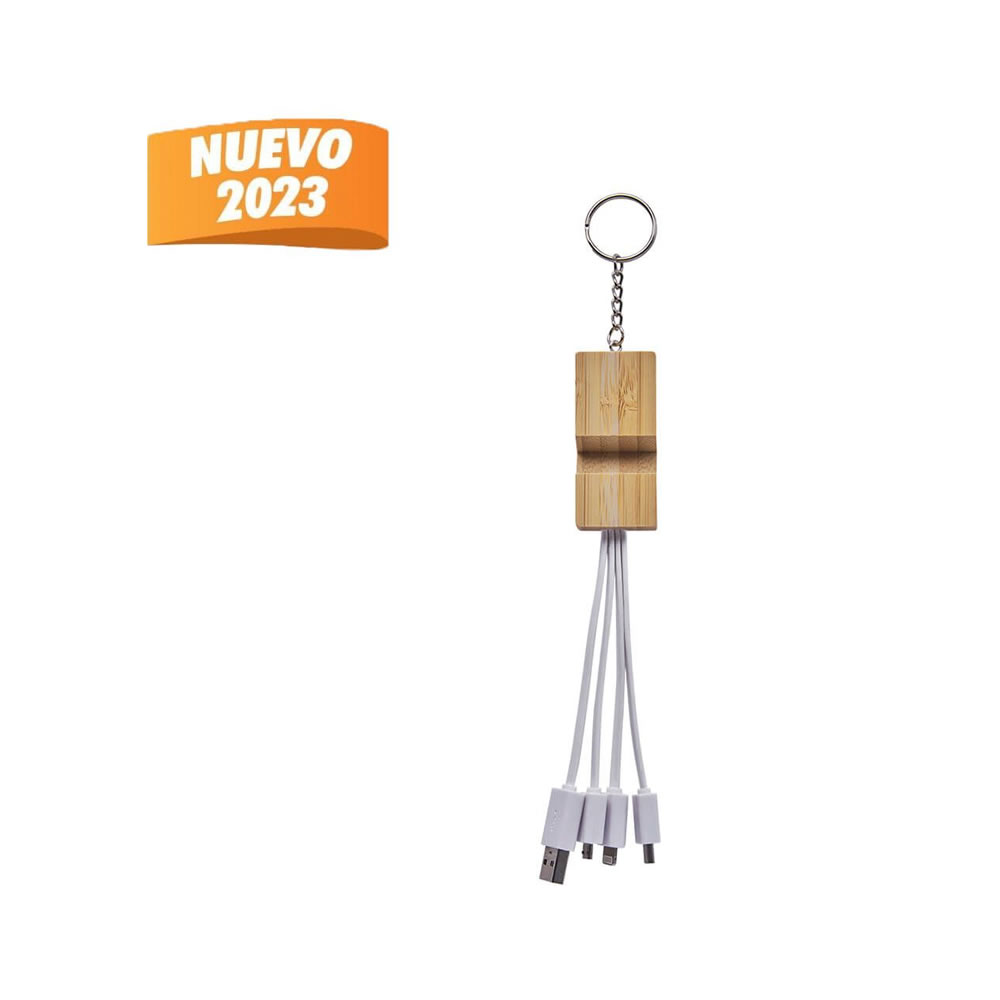 Cable cargador con llavero y holder de bambú. Incluye 4 puntas: USB, micro USB, tipo C y Lightning (8 pines). Salida de 2A. No permite transferencia de datos.