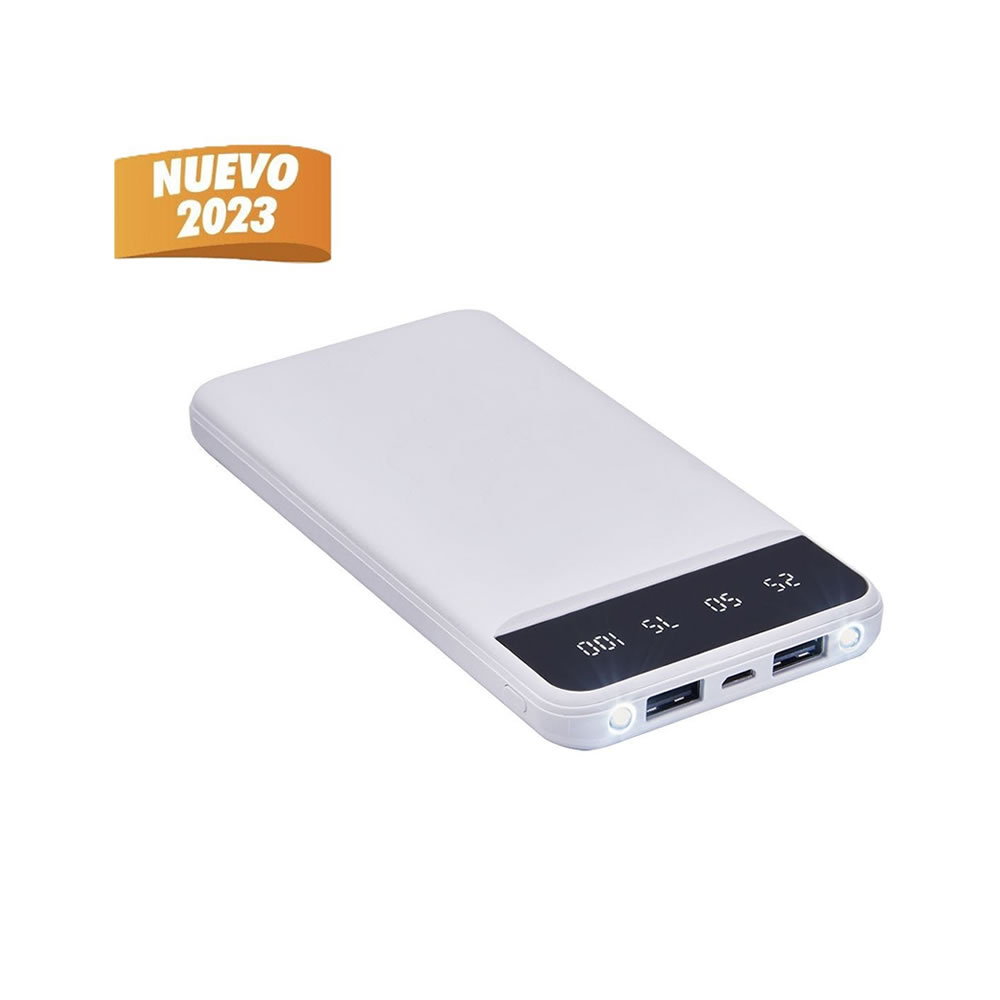 Batería auxiliar para smartphone, capacidad 10,000 mAh. 2 Puertos USB y 1 micro USB. Cuenta con display de indicador de batería y 2 LEDs con función de lámpara. Incluye cable micro USB.