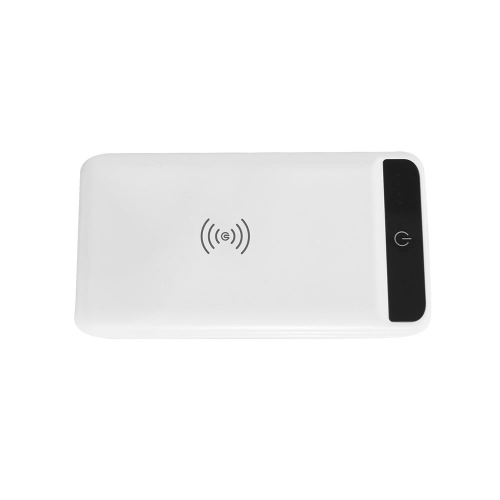Batería auxiliar para smartphone con linterna LED y función de carga inalámbrica. Capacidad 8,000 mAh. Cuenta con 2 salidas USB, entrada micro USB y tipo C. Potencia de carga inalámbrica de 5W. Incluye cable cargador compatible con USB y micro USB.